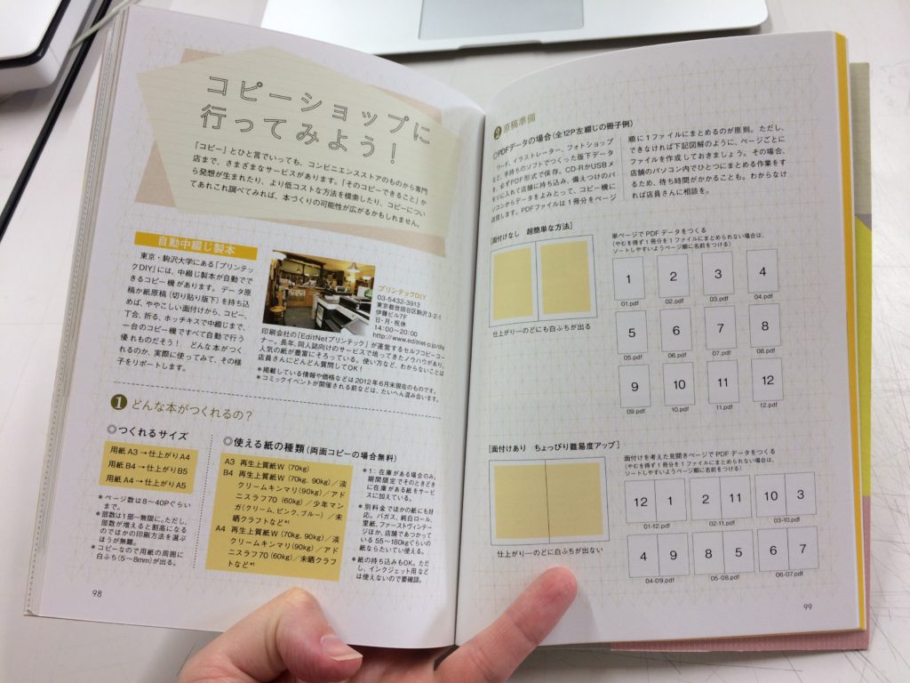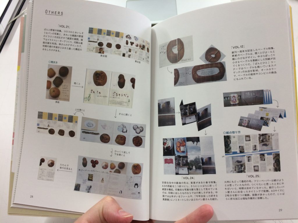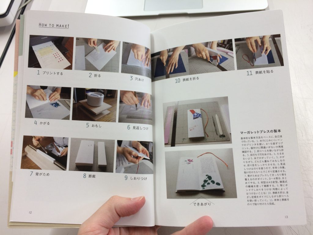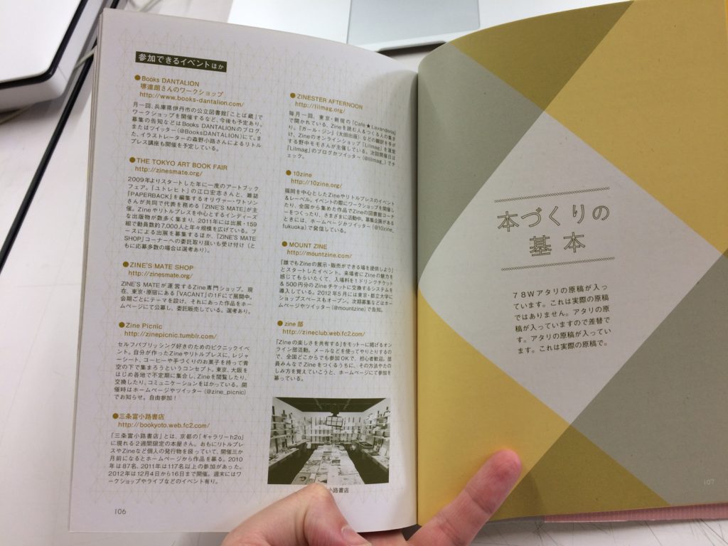 A nice little book which talks about the book or zine making process, and features a number of collected examples of entirely hand-made zines. It breaks down the examples it introduces and gives lots of little hints on tricks you can use to make things differently. There’s a neat section in the back about visiting a copy shop, attending workshops and zine events you can participate in across Japan. Right at the back is a yellow section on binding basics, which explains the make up of different binding methods in an easy to understand way.